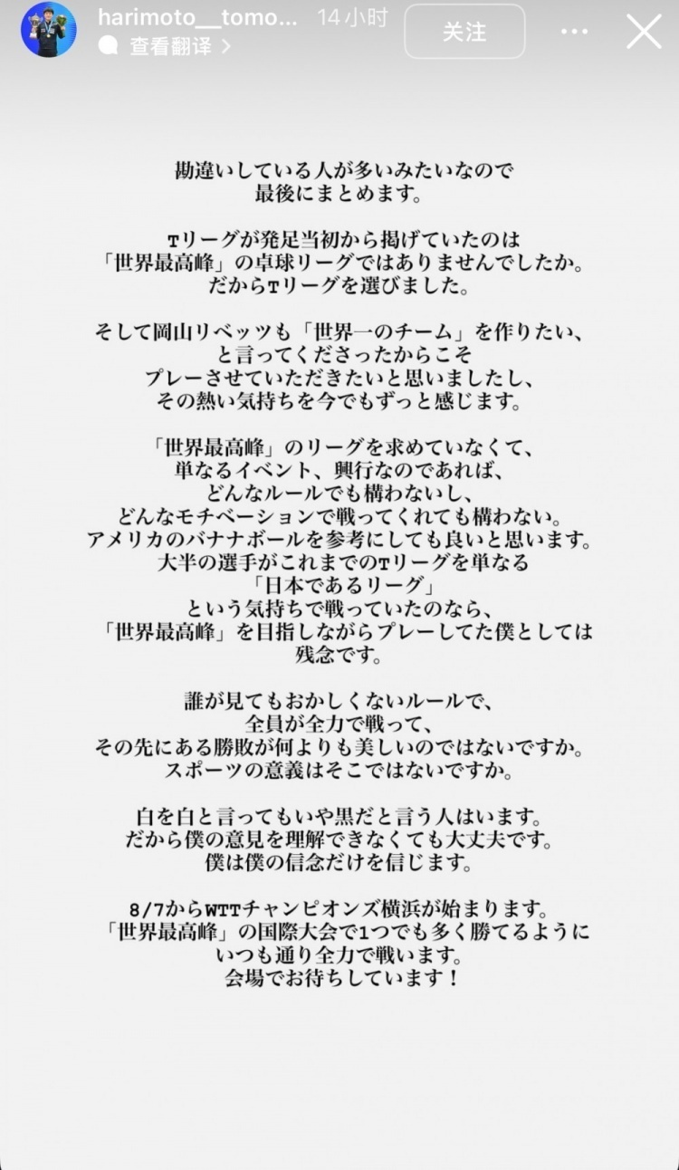 直播吧8月5日讯 昨日,日本乒乓球运动员张本智和在社媒发文炮轰日本乒乓球联赛T联赛,今日他继续更新社媒,表达了对T联赛的看法。